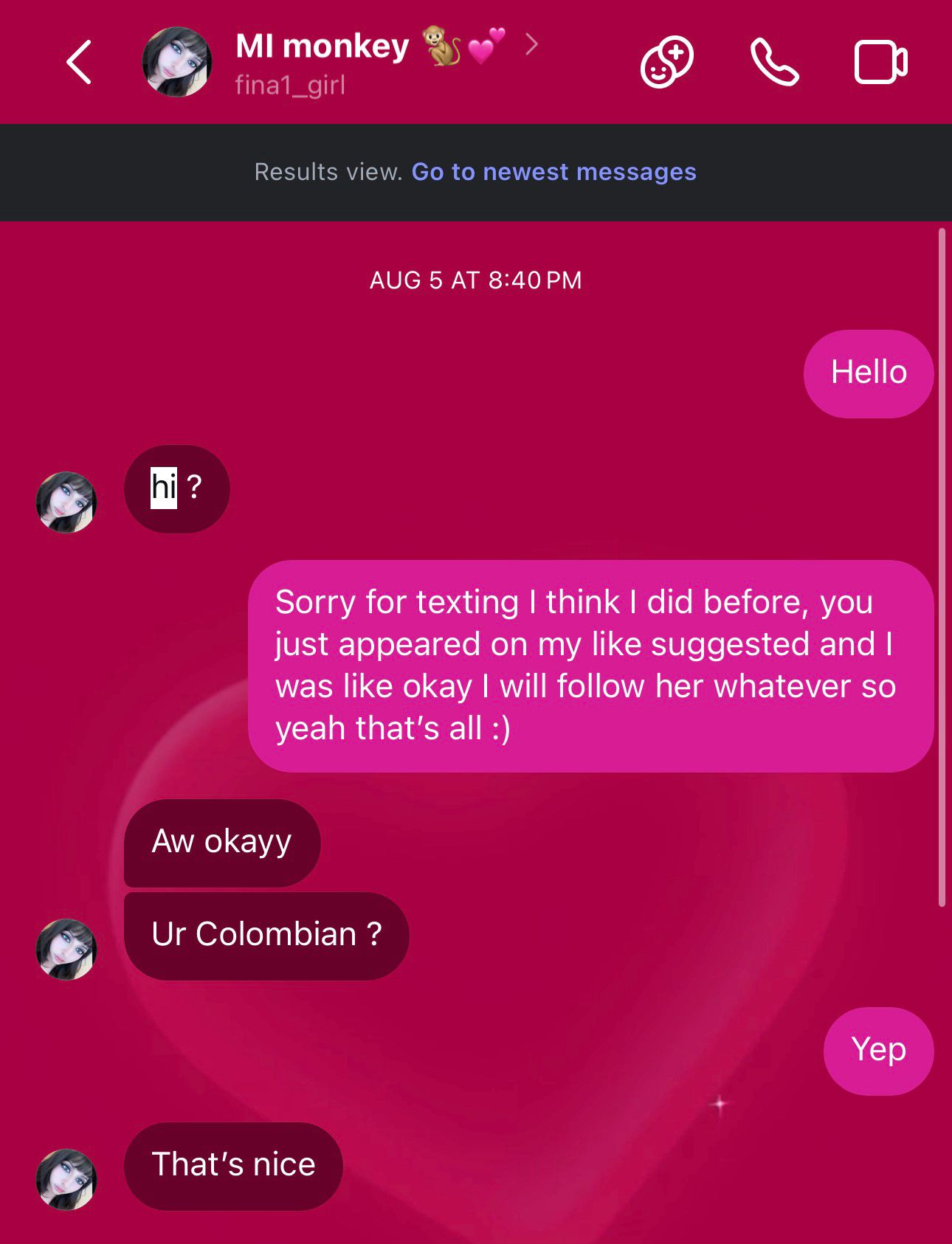 I wanted to remember tyhe first day when I said hello (August 5th at 8:40PM) when you asked me if I were Colombian, and yes I'm the only one that will be always there for you no matter what